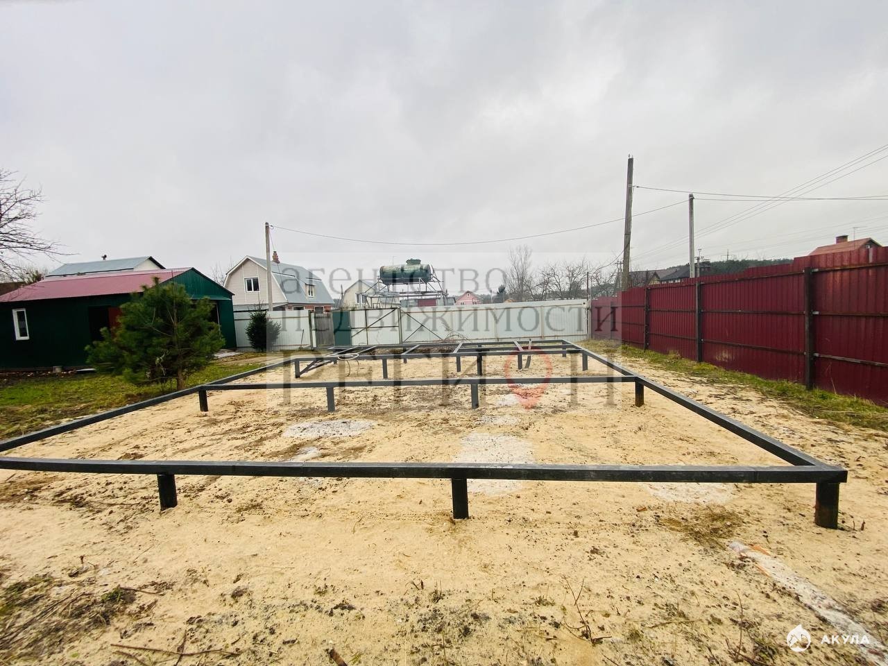 Участок ровный правильной формы , огорожен забором из металлического профиля , на территории расположен гараж , бытовка, колодец, скважина, свайный фундамент ( основная площадь 6*7 м2 + под веранду 6*2 м2), летний туалет, септик Топас, электричество 15 КВт , газ по границе участка, площадка для автомобиля , откатные ворота.